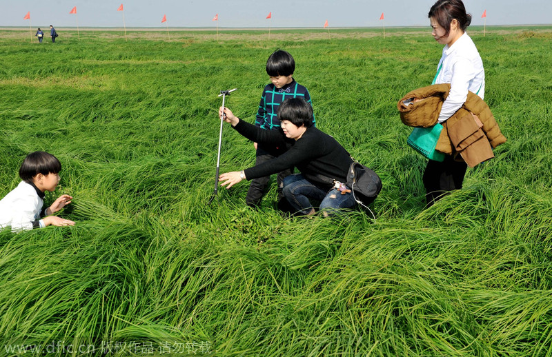 2014年11月23日,江西鄱阳,慕名前来的游客在素有江南“塞上草原”鄱阳湖草洲上感受大自然神奇与美丽。(图片来源:东方IC )