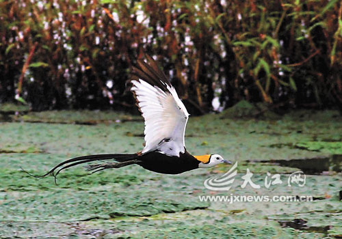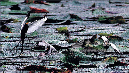5月29日,记者在南昌市象湖湿地花卉公园看到了6对“凌波仙子”翩翩起舞的美丽瞬间。省林业厅鸟类专家告诉记者,这是继去年现身南昌红谷滩和鄱阳湖南矶山湿地之后,夏候鸟水雉再次在我省出现。目前,已属于濒危鸟种的水雉对水质的要求非常高,水雉在象湖湿地繁殖,说明南昌的生态环境越来越好。文/图记者许南平